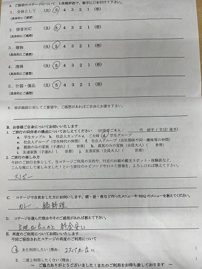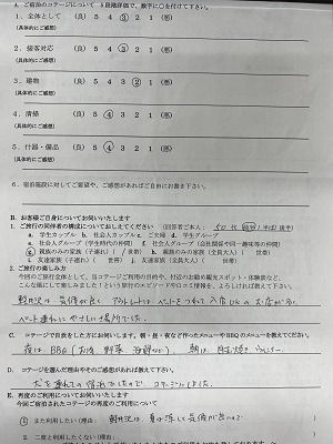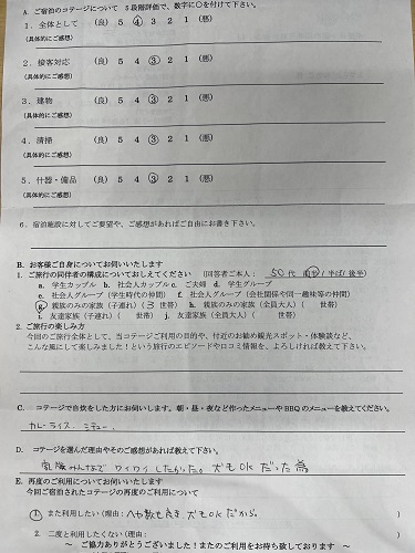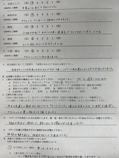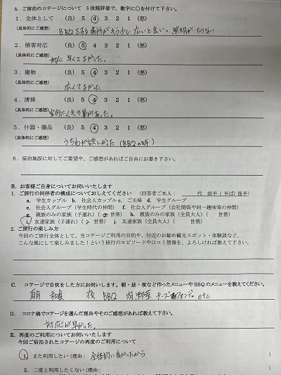 BBQをする場所がもう少し広いと良い。照明がたりない。 対応:早くてよかった。 建物:広くてよかった。室内にくもの巣があった。 什器・備品:うちわが欲しかった(BBQの時) 自炊:朝、和食 夜、BBQ 肉、野菜、チーズフォンデュetc こちらのコテージを選んだ感想:対応が早かった。