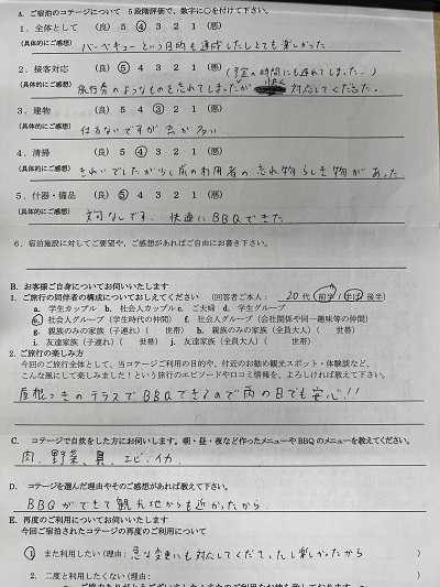 屋根付きのテラスでBBQできるので雨の日でも安心!! 肉・野菜・具・エビ・以下で自炊。 BBQができて観光地からも近かった。 急な変更にも対応してくださったし楽しかったから。また利用したい。