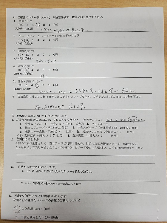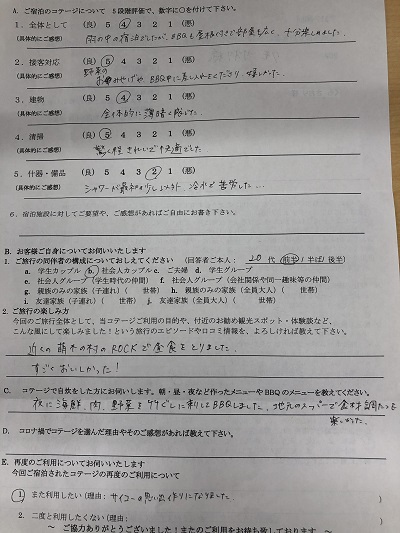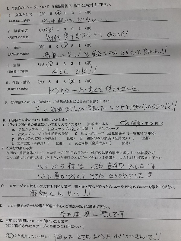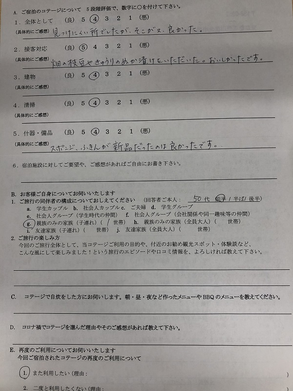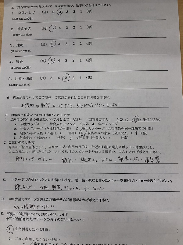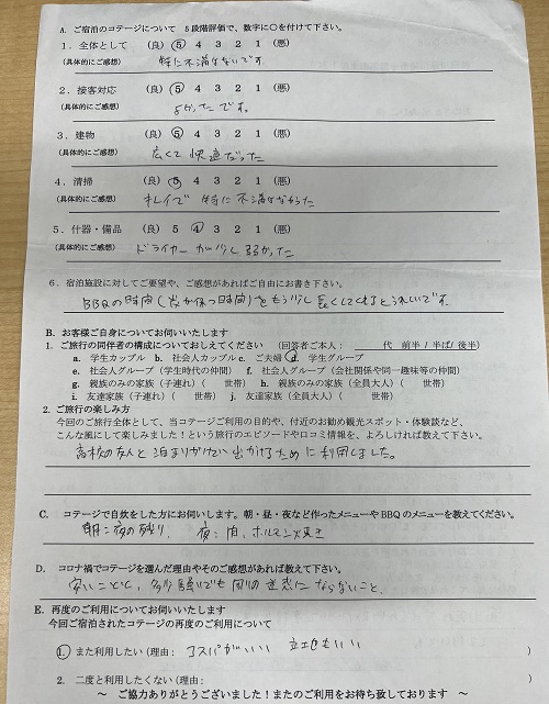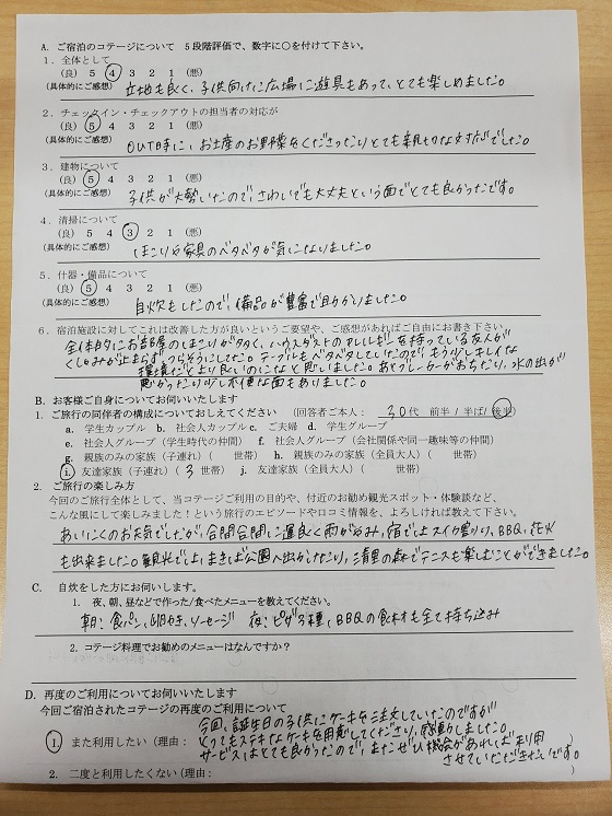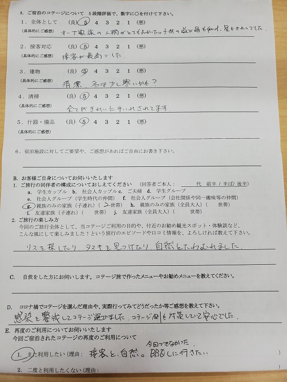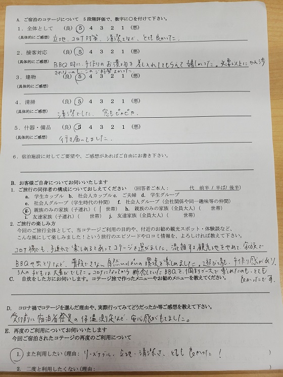 立地・コロナ対策・清潔さなど、とても良かった。 BBQ時に、手作りのお漬物を差し入れしてもらえて嬉しかった。必要以上に干渉されないのも、このご時世よかった。 清掃は清潔でした。窓もピカピカ。 什器・備品、行き届いてました。 コロナ禍でも子連れで楽しめるとあってコテージを選びました。 混雑する観光地をやめて、家族でBBQや虫とりなど、普段できない自然いっぱいの環境を楽しめました。 遊び場も、手作り感があり、3人の子供は大喜びでした。コロナになってから断念していたBBQを、個別ブースで楽しめたのも、とても良かったです。 受付前に宿泊者全員の体温測定など、安心感がもてました。 リーズナブル・立地・清潔さ、とても良かった!