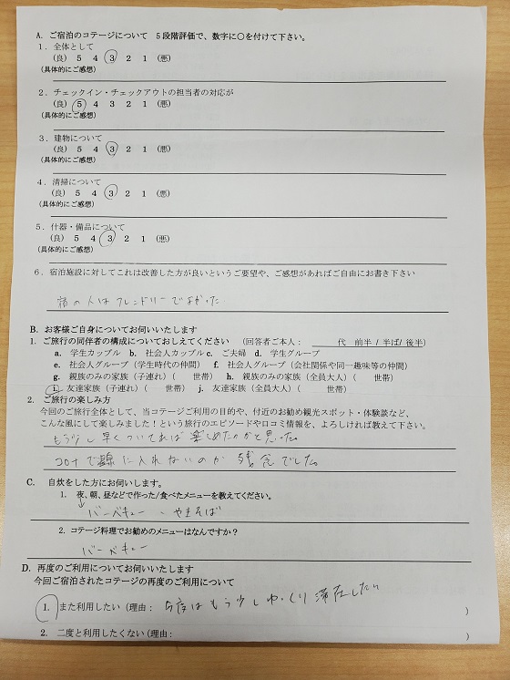 雨の中の宿泊でしたが、BBQも屋根付きで部屋も広く、十分楽しめました。 野菜のおみやげや、BBQ中に差し入れをくださり、嬉しかった。 全体的に建物は薄暗く感じた。 清掃は驚くほどきれいで快適でした。 シャワーが最初の少し以外、冷水で苦労した・・ 近くの萌木の村のROCKで昼食をとりました。すごくおいしかった! 夜に海鮮・肉・野菜を竹ぐしに刺してBBQしました。地元のスーパーで食材調達も楽しかった。 サイコーの思い出作りになりました。