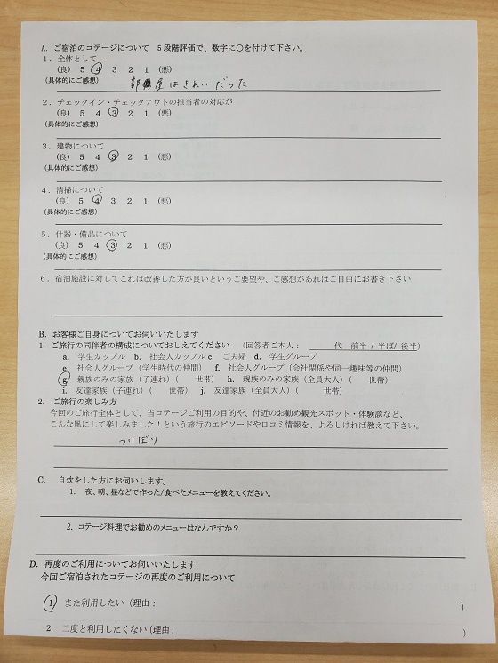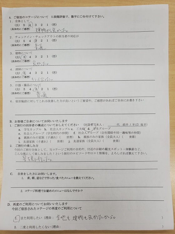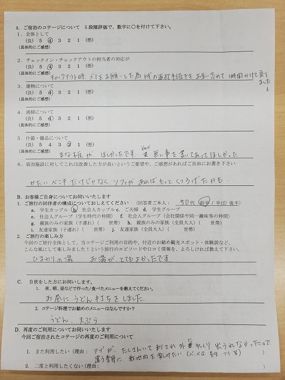 チェックアウト時、ゴミをお願いした為、カギの返却手続きをお互いに忘れて、1時間かけて戻りました。 まな板がほしかったです。それか無い事を書いてほしかった。 かたいベンチだけじゃなく、ソファがあればもっとくつろげたかも… ひまわりの湯へ行きました。お湯がとてもよかったです。 お昼にうどん打ちをしました。 アブがたくさんいて刺され、外にゆっくり出られなかったので違う季節に敷地内を楽しみたい。(バーベQ・星空・つり等) https://www.icu-net.com/ank/901-171-202007-01.jpg