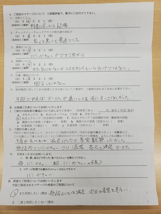 全体として料金に合っている設備だと思う。 バーベキューができて良かった。 什器・備品に困ることはなかった。 可能であれば、スーパーが遠いことを先に言ってほしかった。 天気が良ければ浪合パークで星空観察したかった。 施設内でバーベキュー・つり・温泉・花火と満足できた。 夜・バーベキュー、朝・バーベキューの残りを食べました。 施設としては満足。 次回は星空も見たいと思ったので、また利用したいです。