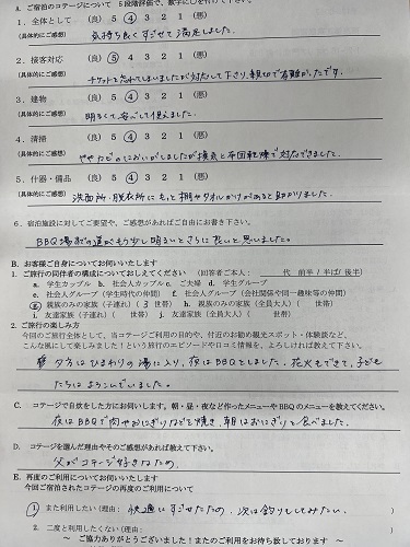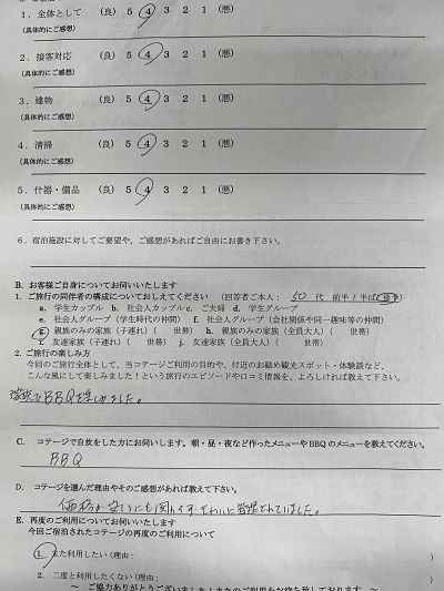 BBQ場までの道がもう少し明るいとさらに良いと思いました。