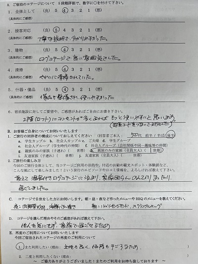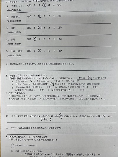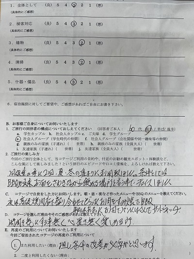接客対応 わかりやすい。 建物 ひろい 清掃 気になるところはなし 什器・備品 小皿がもう少しほしい 近くにアクティビティがそろっていて利便性が良かった。 BBQをしました。 利便性が良かったので、コテージを選びました。 広く、使いやすいので、また利用したい。