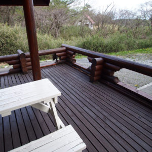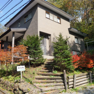 長野県信濃町にあるコテージ。約3万坪の広大な別荘地に2~30名用の建物が点在しています。