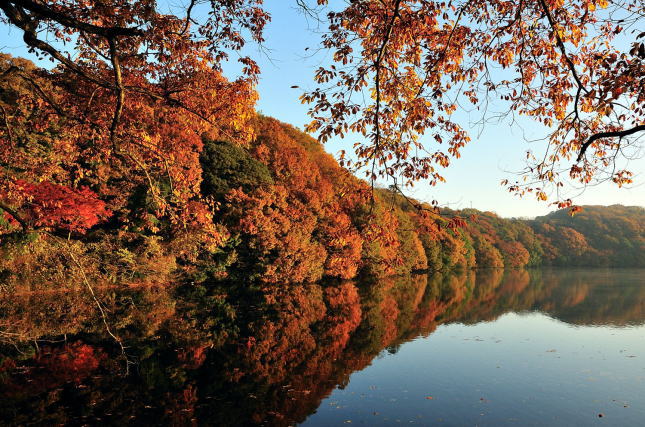 秋の一碧湖は、クヌギ・ブナ・ナラ・モミジで黄色系に色づけられます。