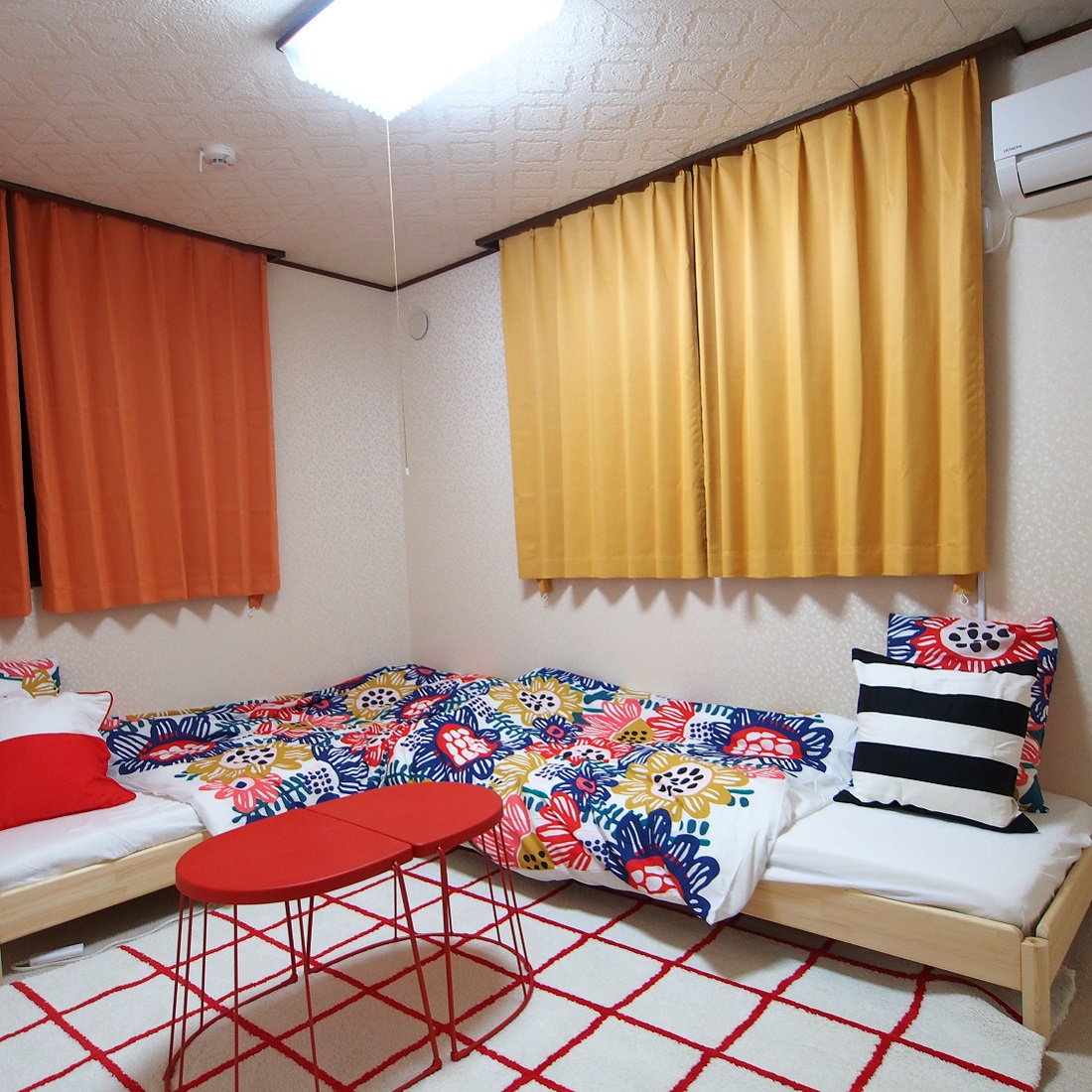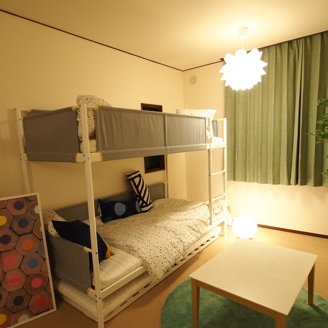 LDKには、テーブルセットと北欧調の明るいデザインのキッチン、和室も和の感じで落ち着いた寝室になっており、ベッドルームは2か所あり。数世帯家族での長期滞在にも快適です。